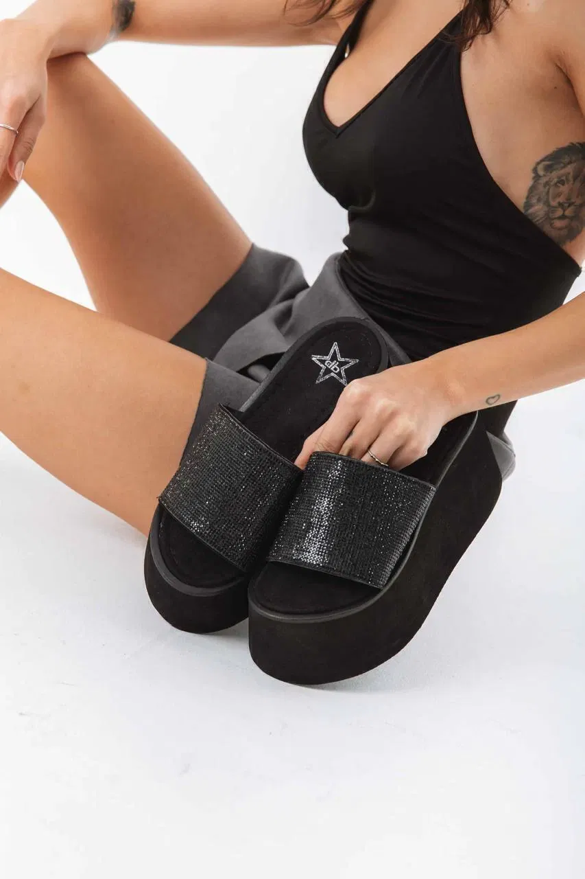 La verdadera joya está en su capellada, confeccionada con un diseño de strass full black que aporta un brillo elegante y sofisticado, perfecto para quienes buscan destacar en cada paso. Además, su plantilla acolchonada garantiza una experiencia suave y placentera, ideal para usar durante todo el día.